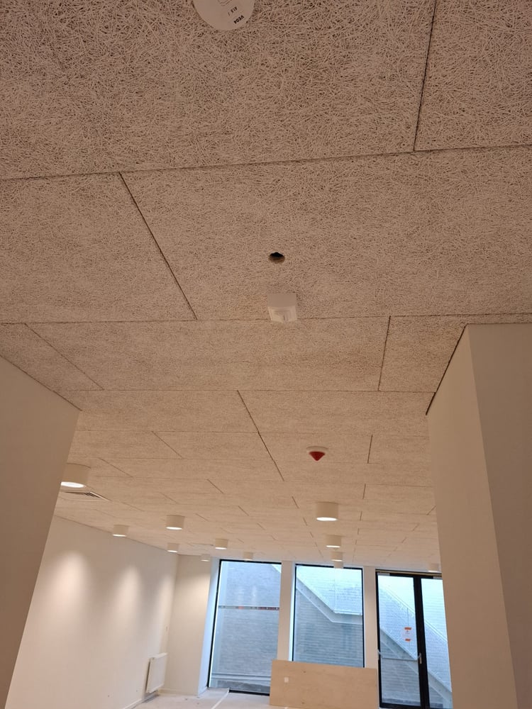 Isolatiewerken hellende daken met dampscherm, Rf wanden, afkastingen en -plafonds, plaatsing van binnendeuren, alle tegelplafonds en  verlaagde plafonds, wanden en plafonds met CLS-houtstructuur, plafonds en wandbekleding met houtwolcementplaten.